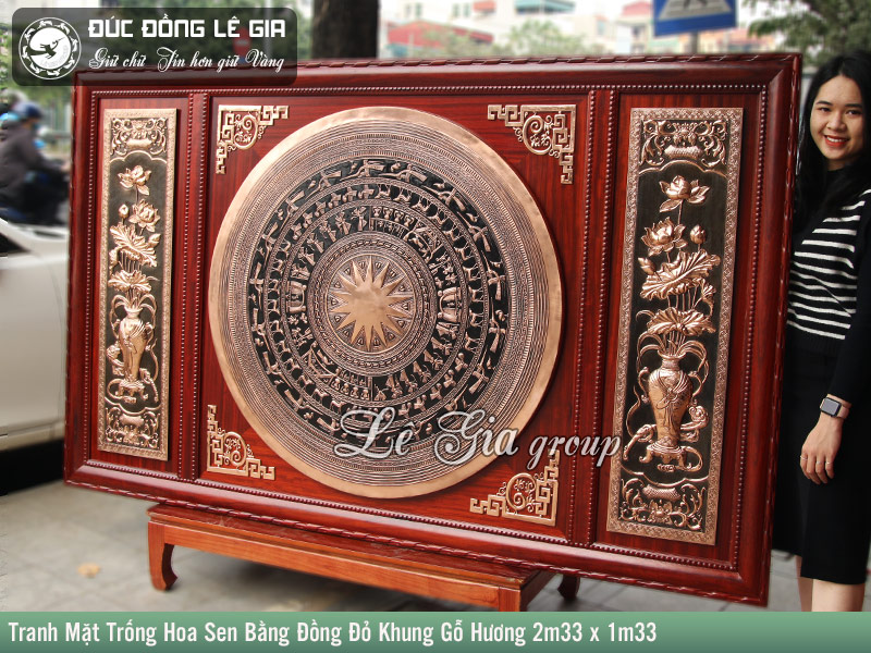 1.5. Tranh Mặt trống đồng hoa sen 217cmx 133cm bằng đồng đỏ màu giả cổ