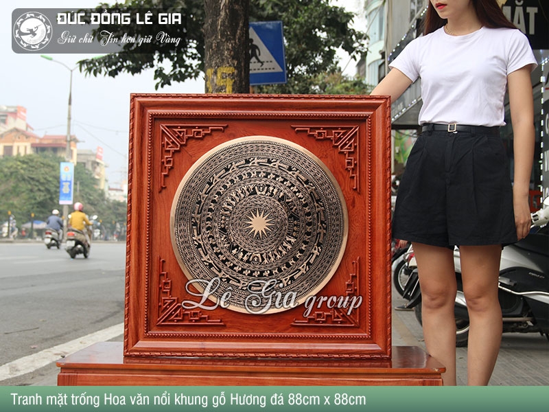 4. Tranh mặt trống treo tường đúc nổi 88cmx88cm khung hương đá